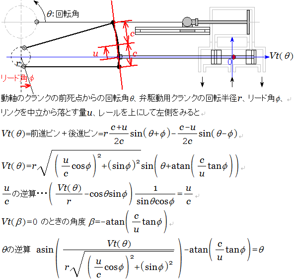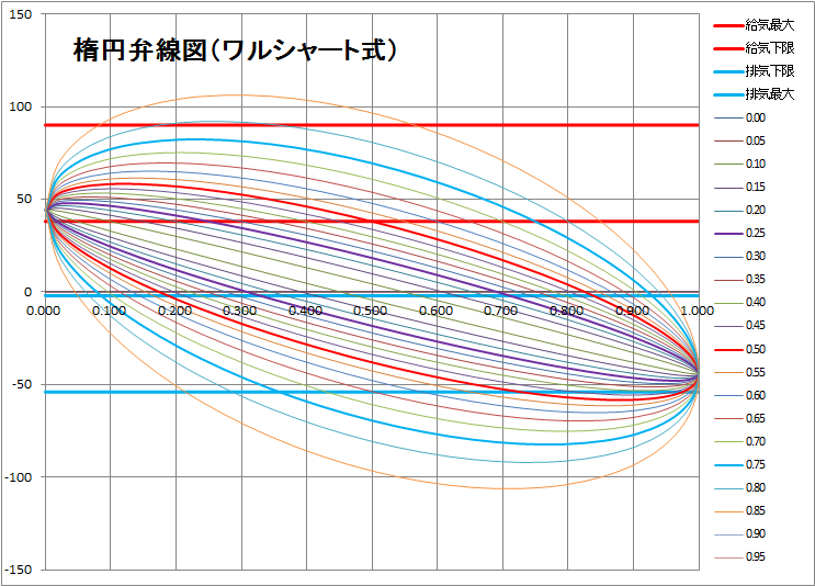 2、ワルシャート式弁装置の弁線図 Vt(θ)の式の形を見れば明らかな通り、回転半径と進角の調整のなされた単なるサイン関数になっている。 3、楕円弁線図の見方 行程を1として、 ε1 : 締切率(カットオフ) ε2 : 1-排気リード ε3 : 圧縮点 ε4 : 給気リード を読み取る。楕円弁線図を描くことで(作図法は省略)ε2~4を導ける。これでいよいよ出力の計算が可能となる。これが楕円弁線図の意味である。 でも今はこんなの書かずとも計算機で便利に求めることができるけどね。エクセルファイルもともにアップしておく。 https://blog.cnobi.jp/v1/blog/user/8081b41d86f00e289bca187351ddd727/1321716405 |