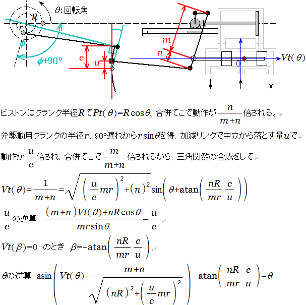 120°単式三気筒機についての図。左側を基準とし、右先行を例とした。クランクが120°割りになってるので、60°ごとに何れかの気筒が死点にあるのは理解しやすい。 ・・・がしかし、主動輪が第2動輪だとメインロッドが第1動輪の軸と重なって困るから回避しなければならない。よっぽど車両限界に余裕があって、要求出力もほどほどなんだったら第1動輪を主動輪とすれば回避もできるんだが・・・ 2、中央気筒を持ち上げて回避する。 そこで中央気筒を持ち上げて避けてみる。 ψ°だけ持ち上げて回避したとき、そのままでは動作タイミングがずれる。そこで、クランク軸もψ°だけ遅らせる。すると・・・ 中央気筒が前死点にあるときは・・・ ということで、元と同じく左が60°進んだときに前死点に至る。後死点は という具合で、きちんと左が240°のときに来る。ということで単式3気筒機の動作は、クランクやメインロッドから見ると殆ど問題になるような点は無い。 唯一、中央ピストンの水平分力がcosψ倍され、またsinψ倍された力が垂直に働くことになるのが問題と言えば問題だが、ψの値がそれほど大きくなければ誤差みたいなものなので気にする必要は無い。 3、ディバイデッドドライブ 他の回避方法としては、中央気筒をかける軸を変えてしまう方法がある。 これなら持上げる必要は無くなるが、先台車とのクリアランスを取れるかどうかという問題が出てくる。 |