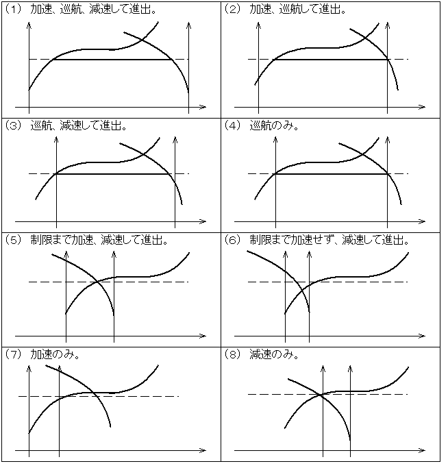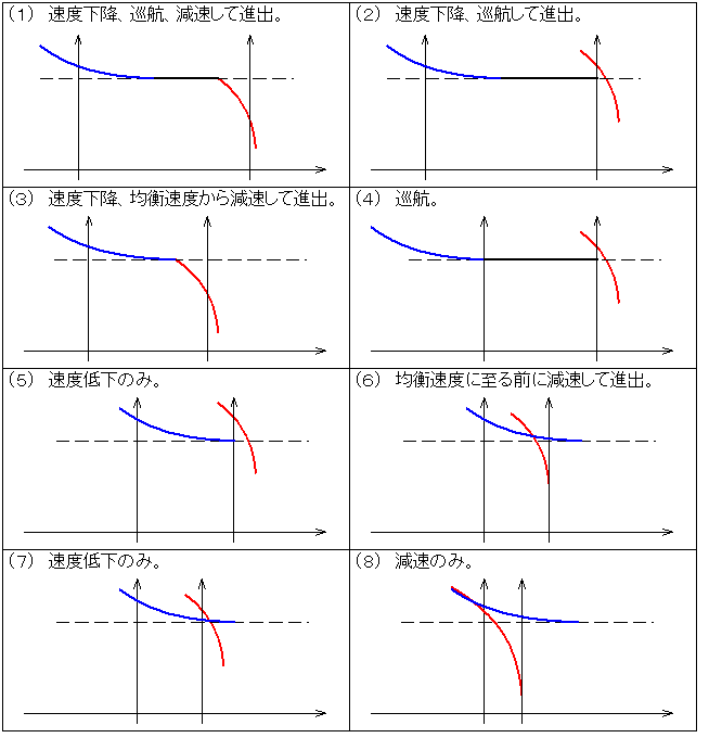 パターン1(8)とパターン2(8)は共にVos<Viのとき無条件で減速のみの区間でかつVosを前区間に渡さなければならないことを示す。当該区間の進入速度Viの上限値としてViに修正をかけると、Vosを直接用いた計算が要らなくなる。