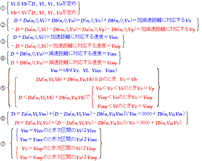 進入速度・進出速度は、区間の前後で停車するなら0にする、当該区間より制限が低かったらその低い制限に合わせる、さらに①②より前の区間のVie、後ろの区間のVosを制限速度の一つと考える・・・の3点について整合性を取ることで最終的な決定を見る。が、区間長に対して加速が鈍いときは隣接区間だけでなくその向こう、それで足りなければそのまた向こうの区間まで考慮しなければならないが、これは繰り返し計算をすることで実現し得る。短い区間があればあるほど、最高速度が高ければ高いほど繰り返しが必要になる。